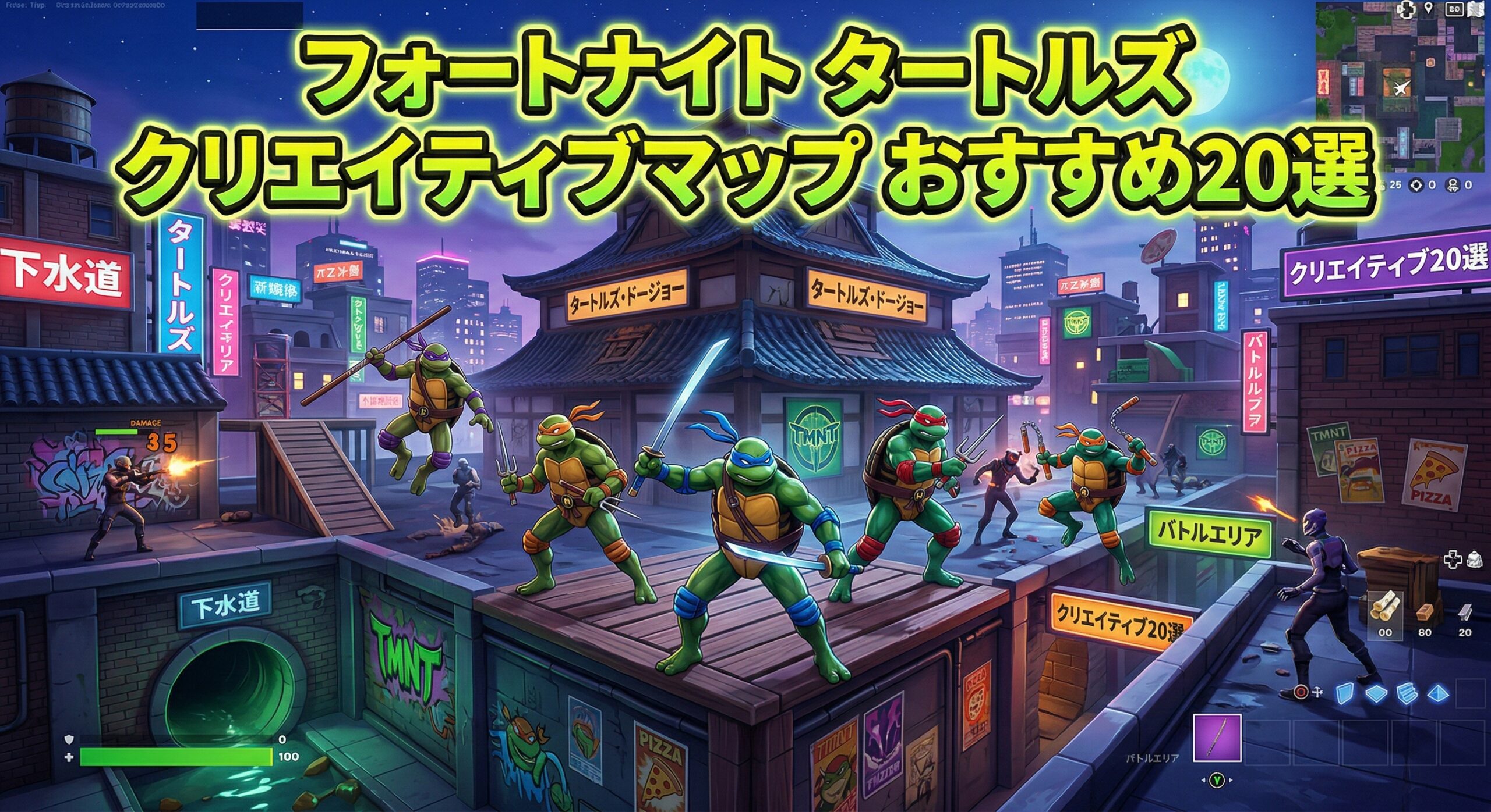 フォートナイトのタートルズ(TMNT)クリエイティブマップをお気に入り数順にまとめました。ニンジャタートルズの世界観で遊べる島を探している方はぜひ参考にしてください!毎日データを更新しているので、今人気のマップをすぐに確認できます。